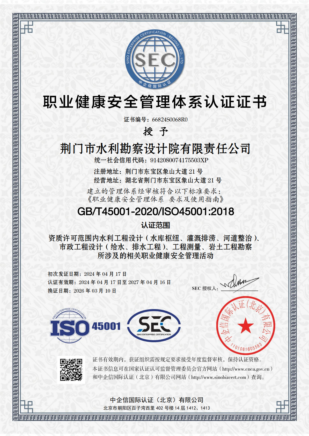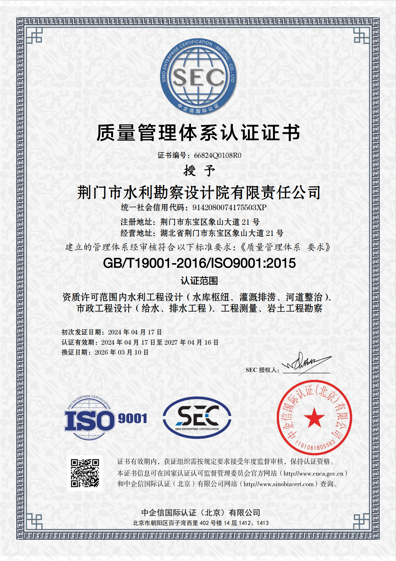 近日,市水務(wù)集團下屬子公司荊門市水利勘察設(shè)計院有限責任公司(以下簡稱“水勘院”)順利通過QES(質(zhì)量、環(huán)境及職業(yè)健康安全)三體系再認證審核,并新增市政工程設(shè)計(給水、排水工程)認證范圍,這標志著水勘院從水利工程向市政水務(wù)工程領(lǐng)域邁出了實質(zhì)性的一步。
